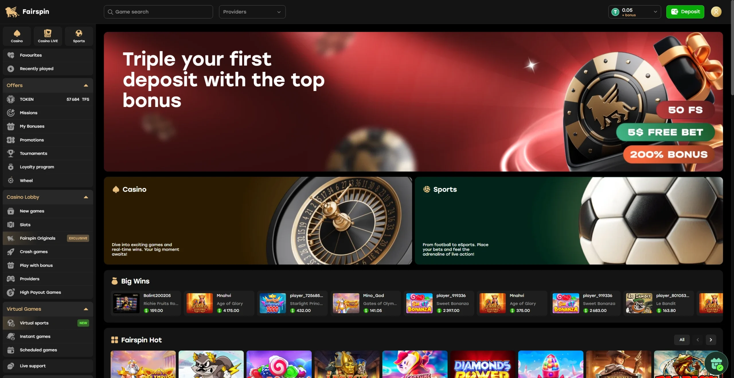 Fairspin offers more than 5,000 games from over 80 providers, including slots, live casino games, and sports betting.